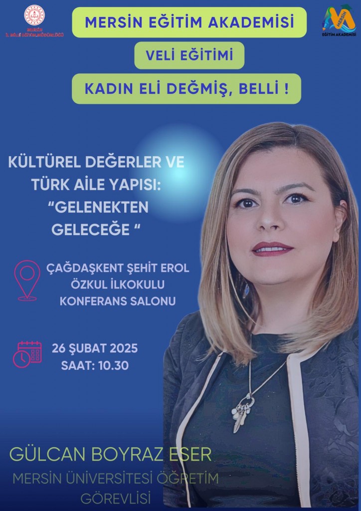 Üniversitemiz Rehberlik ve Psikolojik Danışmanlık Uygulama ve Araştırma Merkezi bünyesinde görev yapmakta olan Öğr. Gör. Gülcan Boyraz Eser, Mersin İl Milli Eğitim Müdürlüğü tarafından yürütülen "Kadın Eli Değmiş, Belli! " projesi kapsamında 26 Şubat 2025 tarihinde Toroslar İlçe Milli Eğitim Müdürlüğü işbirliği ile Çağdaşkent Şehit Erol Özkul İlkokulu Konferans Salonunda velilere yönelik bir seminer gerçekleştirmiştir.