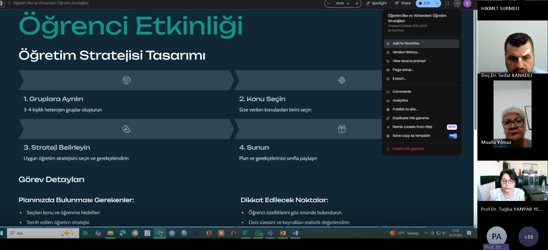 Etkinlikte, yapay zekâ teknolojilerinin eğitim alanındaki kullanımına odaklanılarak, öğrenme ve öğretme süreçlerinin farklı aşamalarında uygulanabilecek yapay zekâ araçları uygulamalı biçimde tanıtıldı. Katılımcılara, öğretim planı hazırlama, ölçme-değerlendirme, sunum, görsel, video, oyun, simülasyon ve bilgi kartı oluşturma gibi öğretim süreçlerinde kullanılabilecek istem (prompt) uygulamaları hakkında örnekler sunuldu.