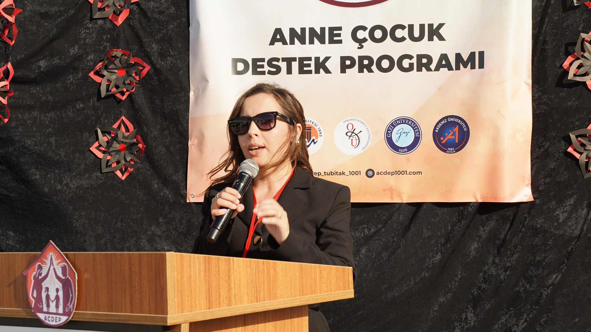 Açış konuşmasını yapan proje yürütücüsü Doç. Dr. Feyza Uçar Çabuk, AÇDEP’in amacına ilişkin, “Projemiz kapsamında geliştirilen Anne Çocuk Destek Programı, 6 Şubat depremini yaşamış annelerin çocuklarıyla ilişkilerini güçlendirmeyi, annelerin ve çocukların kaygı seviyelerini azaltmayı, ebeveyn öz yeterliğini ve çocukların duygu düzenleme becerilerini desteklemeyi amaçlamaktadır. Bu doğrultuda, geçtiğimiz yıl Osmaniye’de konteyner kentte yaşayan okul öncesi dönem çocuğu olan annelerle görüşmeler yaparak eğitim ihtiyaçlarını belirledik. Uzman kadromuzla birlikte bu ihtiyaçlara yönelik hem annelere özel oturumları hem de annelerin çocuklarıyla birlikte evde yapabilecekleri etkinlikleri içeren AÇDEP’i hazırladık. Program kapsamında her oturum için annelere dağıtılacak kitaplar da belirlendi.” ifadelerini kullandı.