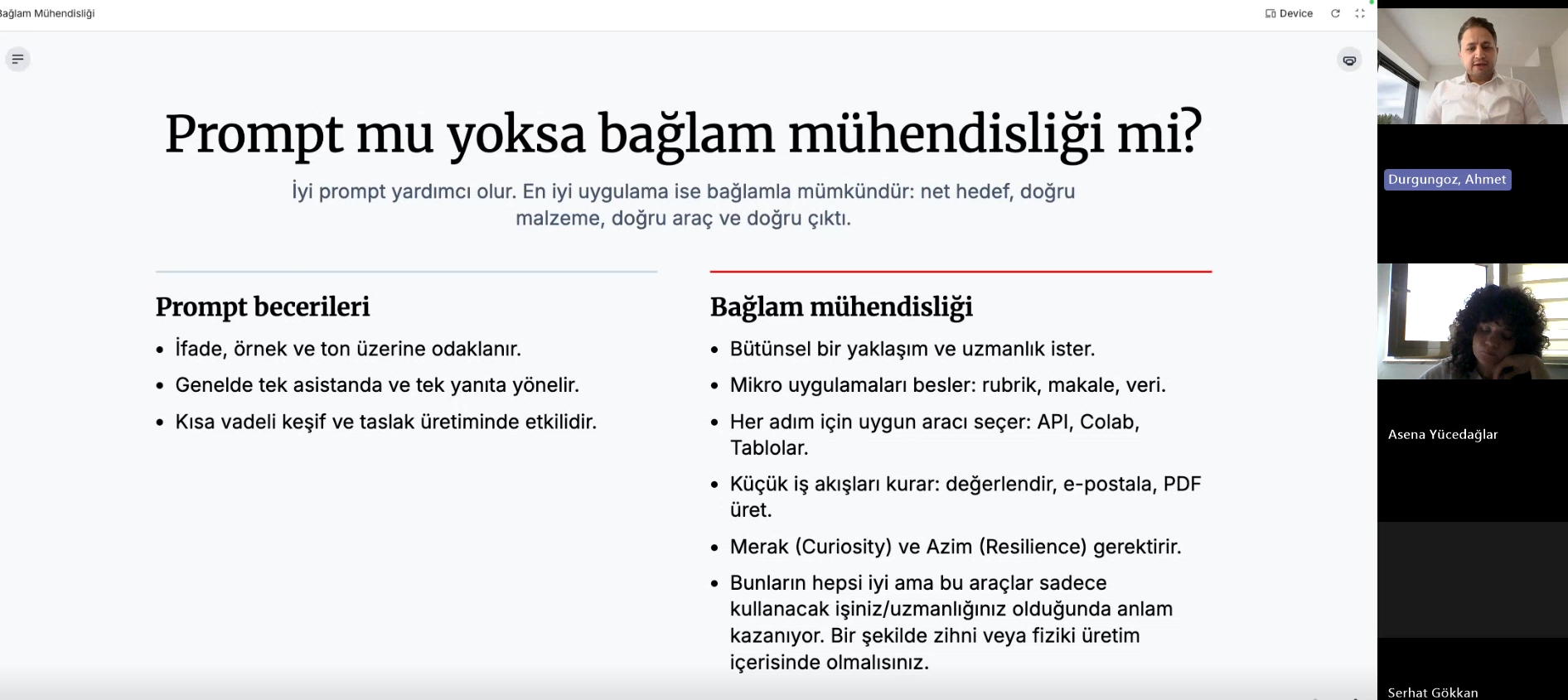 Etkinlikte, eğitimcinin değişen rolleri, bağlam mühendisliği yaklaşımı, açık uçlu yanıt değerlendirme yöntemleri ve Uygulama Programlama Arabirimi (API - Application Programming Interface) konularında kapsamlı bilgiler paylaşıldı. Ayrıca, yapay zekâ araçlarının eğitim ortamlarında nasıl etkili biçimde kullanılabileceğine ilişkin örnek uygulamalara yer verildi.