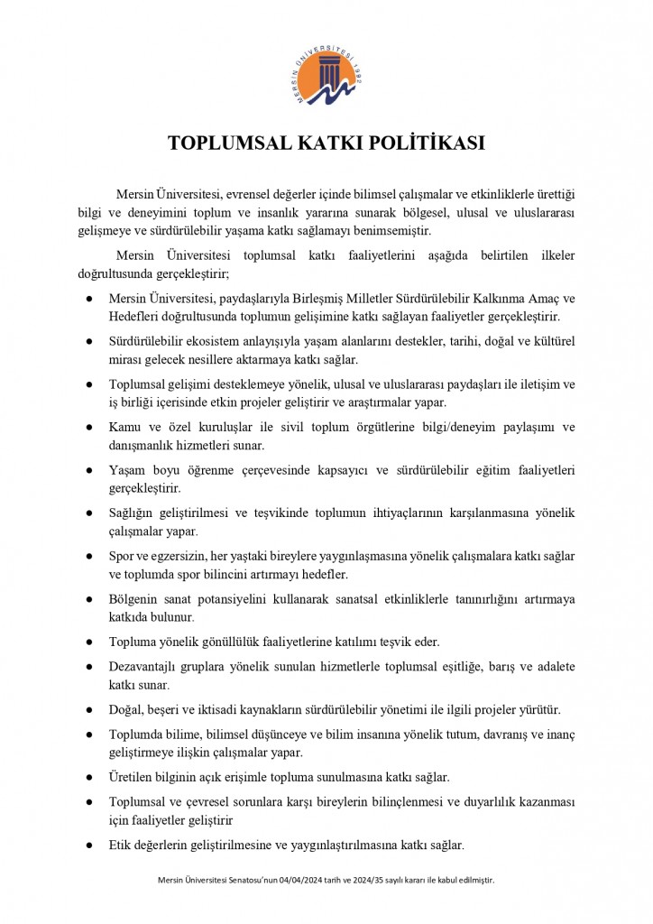 Mersin Üniversitesi Senatosunun 04/04/2024 Tarih ve 2024/35 Sayılı Kararı ile Kabul Edilen Toplumsal Katkı Politikası