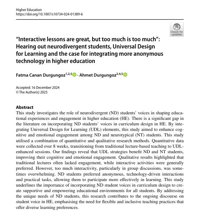 Durgungoz, F.C., Durgungoz, A. “Interactive lessons are great, but too much is too much”: Hearing out neurodivergent students, Universal Design for Learning and the case for integrating more anonymous technology in higher education. High Educ (2025). https://doi.org/10.1007/s10734-024-01389-6