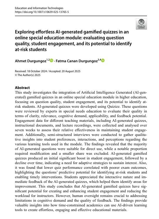 Durgungoz, A., Durgungoz, F.C. Exploring effortless AI-generated gamified quizzes in an online special education module: evaluating question quality, student engagement, and its potential to identify at-risk students. Educ Inf Technol (2025). https://doi.org/10.1007/s10639-025-13765-5
