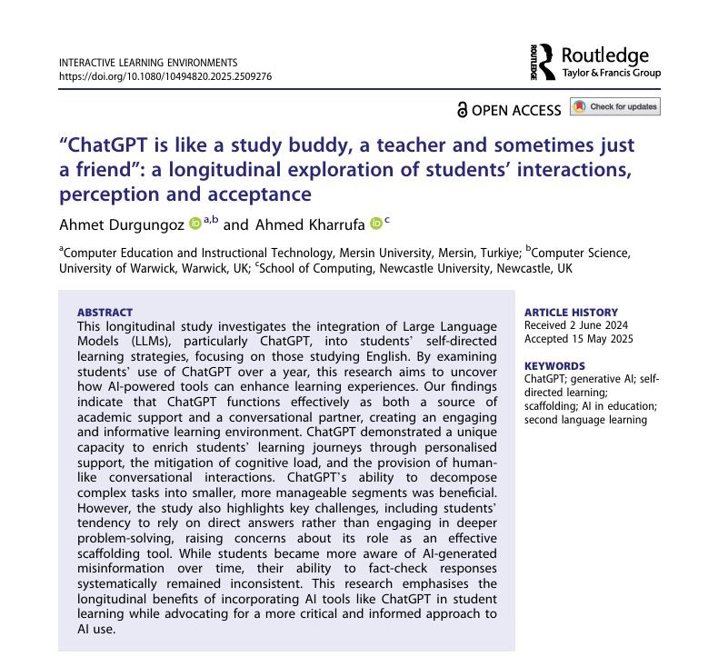 Durgungoz, A., & Kharrufa, A. (2025). “ChatGPT is like a study buddy, a teacher and sometimes just a friend”: a longitudinal exploration of students’ interactions, perception and acceptance. Interactive Learning Environments, 1–20. https://doi.org/10.1080/10494820.2025.2509276