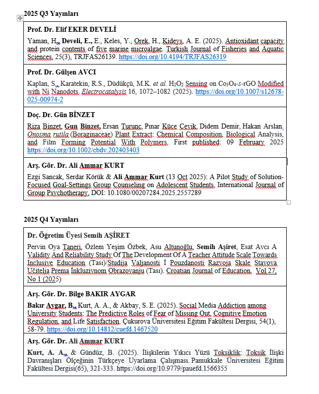 Öğretim üyelerimizin bilimsel üretim süreçlerindeki özverili emekleri, üniversitemizin “nitelikli araştırma” vizyonuna önemli bir değer katmaktadır. Fakültemiz adına, 2025 yılı içerisinde uluslararası indeksli dergilerde yayın yapan tüm öğretim üyelerimizi içtenlikle tebrik eder; başarılarının devamını dileriz.