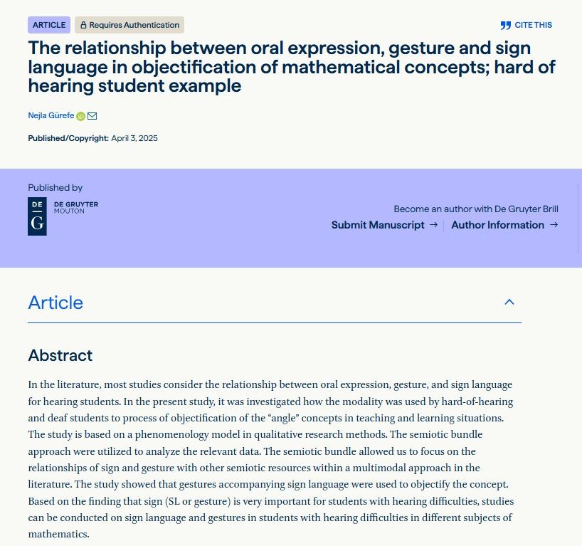 Gürefe, Nejla. "The relationship between oral expression, gesture and sign language in objectification of mathematical concepts; hard of hearing student example" Applied Linguistics Review, vol. 16, no. 5, 2025, pp. 2353-2371. https://doi.org/10.1515/applirev-2024-0099