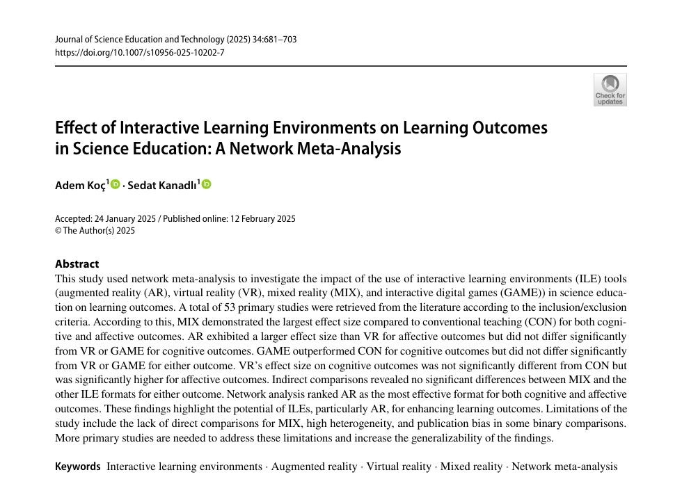 Koç, A., Kanadlı, S. Effect of Interactive Learning Environments on Learning Outcomes in Science Education: A Network Meta-Analysis. J Sci Educ Technol 34, 681–703 (2025). https://doi.org/10.1007/s10956-025-10202-7
