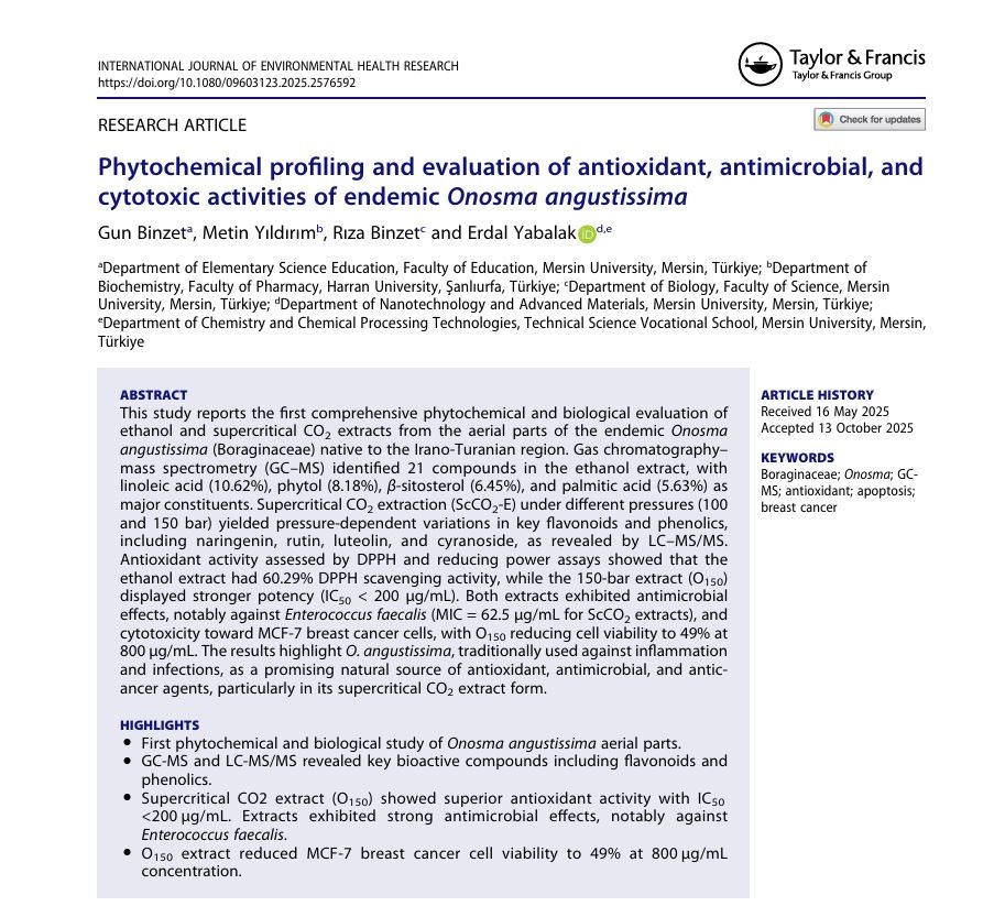 Gun Binzet, Metin Yıldırım, Rıza Binzet & Erdal Yabalak (18 Oct 2025): Phytochemical profiling and evaluation of antioxidant, antimicrobial, and cytotoxic activities of endemic Onosma angustissima, International Journal of Environmental Health Research, DOI: 10.1080/09603123.2025.2576592