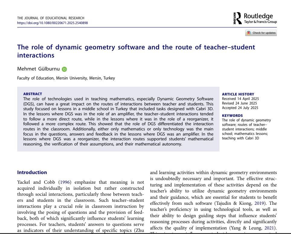 Mehmet Gülburnu (01 Aug 2025): The role of dynamic geometry software and the route of teacher–student interactions, The Journal of Educational Research, DOI: 10.1080/00220671.2025.2540898