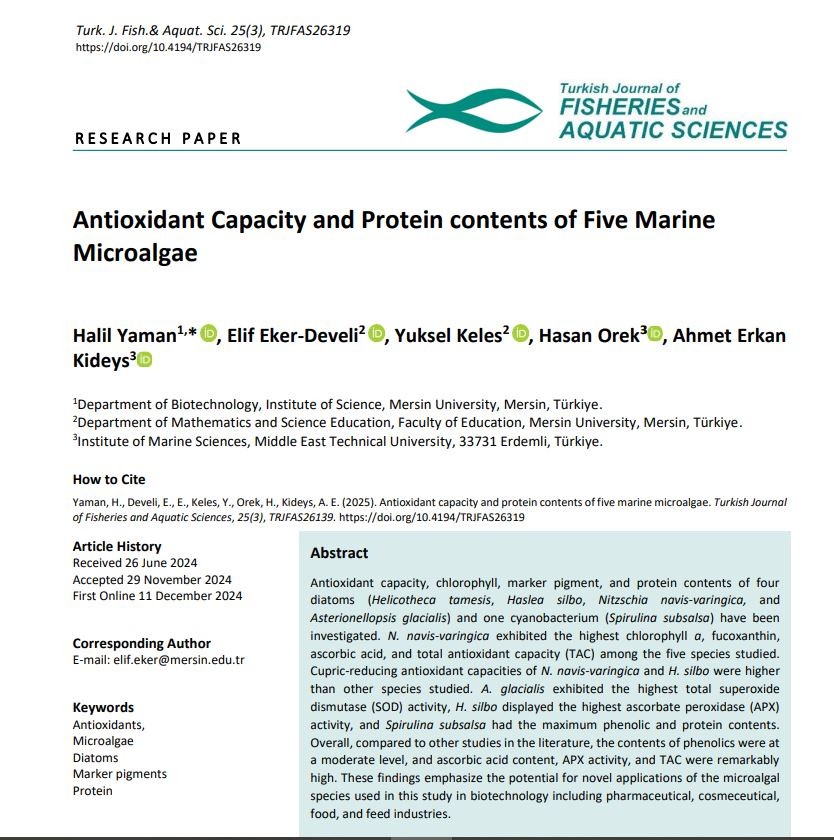 Yaman, H., Develi, E., E., Keles, Y., Orek, H., Kideys, A. E. (2025). Antioxidant capacity and protein contents of five marine microalgae. Turkish Journal of Fisheries and Aquatic Sciences, 25(3), TRJFAS26139. https://doi.org/10.4194/TRJFAS26319