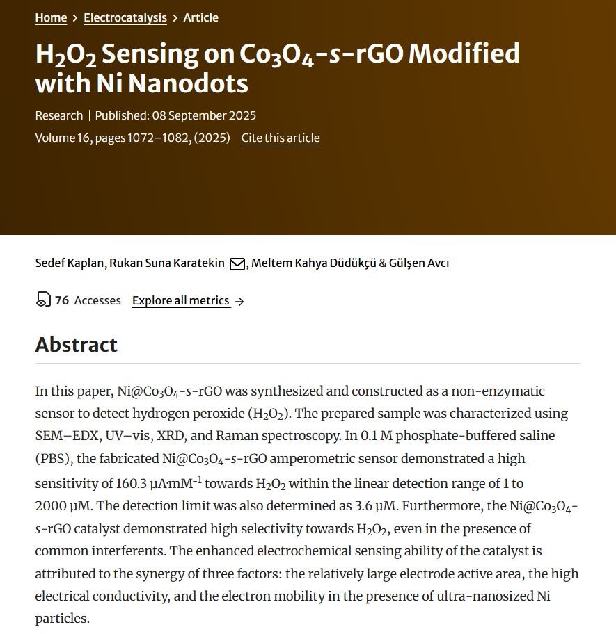 Kaplan, S., Karatekin, R.S., Düdükçü, M.K. et al. H2O2 Sensing on Co3O4-s-rGO Modified with Ni Nanodots. Electrocatalysis 16, 1072–1082 (2025). https://doi.org/10.1007/s12678-025-00974-2