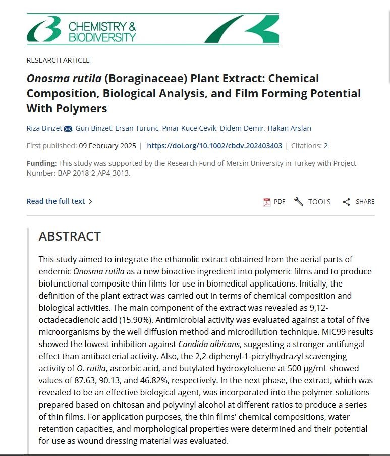 Riza Binzet, Gun Binzet, Ersan Turunc, Pınar Küce Cevik, Didem Demir, Hakan Arslan. Onosma rutila (Boraginaceae) Plant Extract: Chemical Composition, Biological Analysis, and Film Forming Potential With Polymers. First published: 09 February 2025 https://doi.org/10.1002/cbdv.202403403