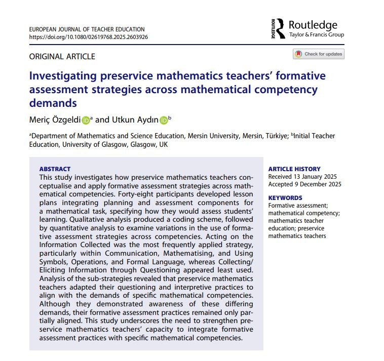 Doç. Dr. Nejla GÜREFE Gürefe, Nejla. "The relationship between oral expression, gesture and sign language in objectification of mathematical concepts; hard of hearing student example" Applied Linguistics Review, vol. 16, no. 5, 2025, pp. 2353-2371. https://doi.org/10.1515/applirev-2024-0099 Doç. Dr. Meriç Özgeldi Meriç Özgeldi & Utkun Aydın (18 Dec 2025): Investigating preservice mathematics teachers’ formative assessment strategies across mathematical competency demands, European Journal of Teacher Education, DOI: 10.1080/02619768.2025.2603926 |