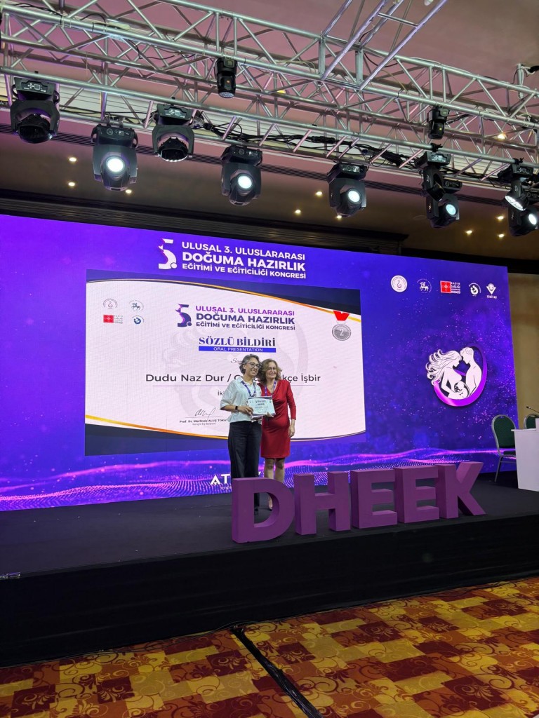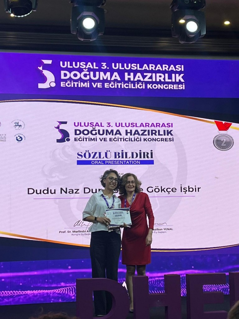 Üniversitemiz Sağlık Bilimleri Fakültesi Ebelik Bölümü öğretim üyesi Prof. Dr. Gözde Gökçe İsbir ve yüksek lisans öğrencisi Uzm. Ebe Dudu Naz Dur, 3. Uluslararası 5. Ulusal Doğuma Hazırlık Eğitimi ve Eğiticiliği Kongresi’nde “Doğumda Travma Bilgisi İçeren Destekleyici Bakımın Psikolojik Sonuçlara Etkisi: Randomize Kontrollü Çalışma” başlıklı bildirileri ile sözel bildiri dalında ikincilik ödülüne layık görüldü.
