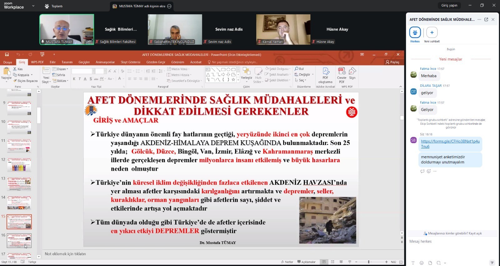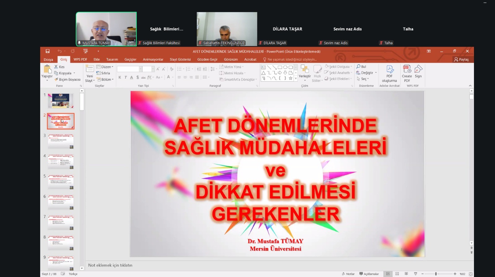 Mersin Üniversitesi Sağlık Bilimleri Fakültesi Sağlık Yönetimi Bölümü tarafından, “Afet Dönemlerinde Sağlık Müdahaleleri ve Dikkat Edilmesi Gerekenler” konulu çevrim içi bir seminer düzenlendi.