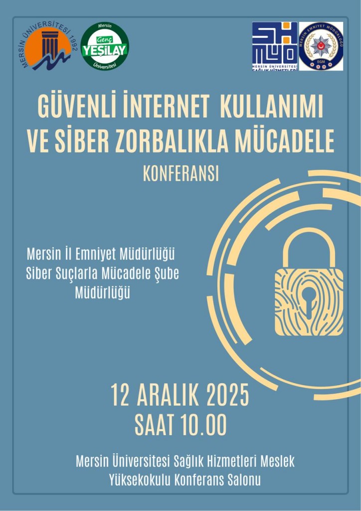 Mersin Üniversitesi Sağlık Hizmetleri Meslek Yüksekokulumuz, Genç Yeşilay Topluluğu ve Mersin İl Emniyet Müdürlüğü Siber Suçlarla Mücadele Şube Müdürlüğü iş birliğinde “Güvenli İnternet Kullanımı ve Siber Zorbalıkla Mücadele Konferansı” düzenliyoruz.