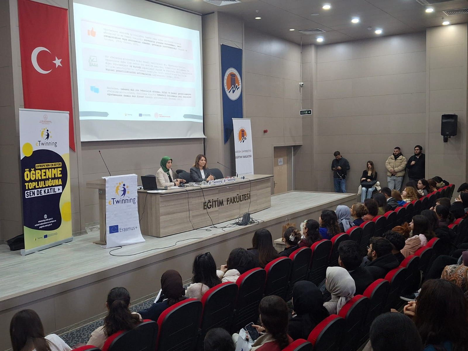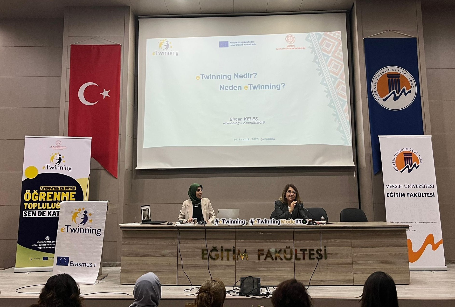 Fakültemiz öğrencilerine yönelik olarak eTwinning çalışmalarına ilişkin bilgilendirme toplantısı gerçekleştirildi. eTwinning ITE Koordinatörü öğretim üyemiz Doç. Dr. Ümit İzgi Onbaşılı ve Mersin İl eTwinning Koordinatörü Bircan Keleş tarafından yürütülen toplantı, öğretmen adaylarının ulusal ve uluslararası proje kültürünü geliştirmeyi amaçladı. Fakültemizin tüm programlarından öğretmen adaylarının katılım sağladığı etkinlik, yoğun ilgi gördü.