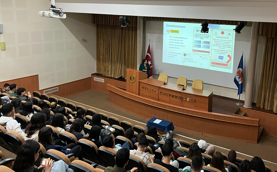 Mersin Üniversitesi Hemşirelik Fakültesi öğrencilerine, T.C. Cumhurbaşkanlığı İletişim Başkanlığı tarafından hazırlanan "Dezenformasyonla Mücadele Farkındalık Eğitimleri" verildi. Eğitim, 02-03 Aralık 2025 tarihlerinde Prof. Dr. Uğur Oral Kültür Merkezi’nde Dr. Öğr. Üyesi Esra ÇAVUŞOĞLU tarafından gerçekleştirildi. Programda dezenformasyonun tanımı, türleri, örnekleri ve dezenformasyonla mücadele yolları ayrıntılı biçimde ele alındı. Video sunumlarıyla desteklenen etkinlik sonunda öğrencilerin soruları yanıtlandı. Eğitim sonunda öğrencilerin dezenformasyon kavramına ilişkin eksik bilgileri tamamlanarak doğru bilgiler pekiştirildi. Katılımcılar, dezenformasyonla mücadelede daha bilinçli hale gelirken, etkinlik verimli ve öğretici bir şekilde tamamlandı.