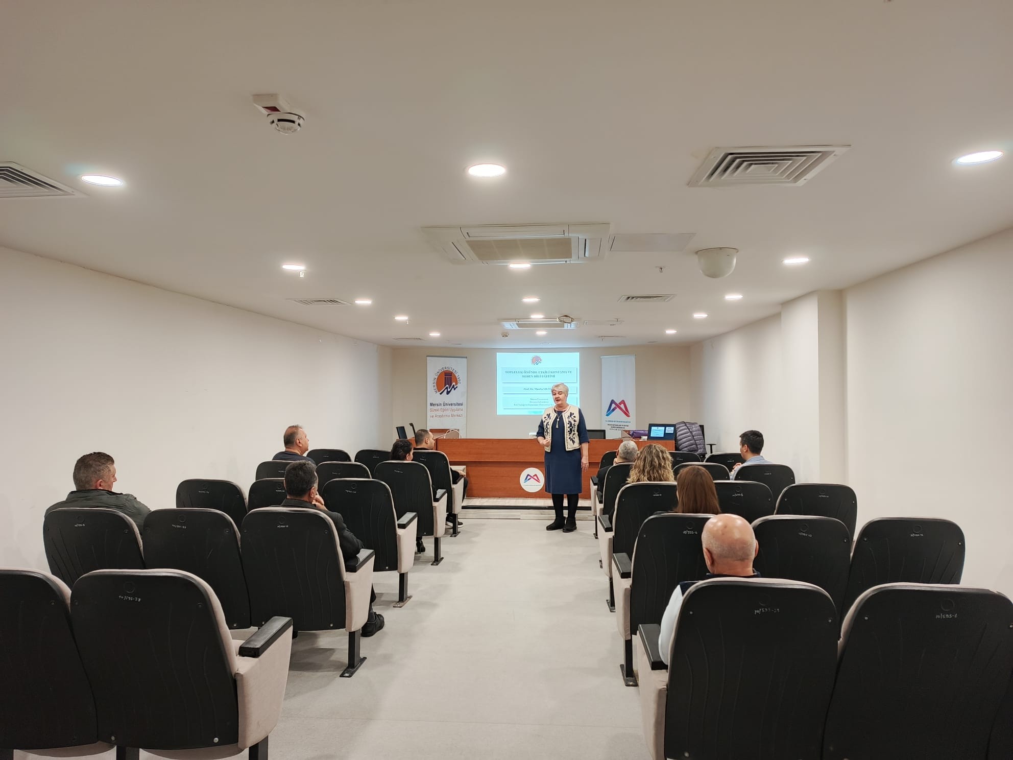 Prof. Dr. Mualla YILMAZ tarafından, 11 Aralık 2025 tarihinde, Mersin Büyükşehir Belediyesi çalışanlarına yönelik olarak “Topluluk Önünde Konuşma ve Beden Dili” konulu bir eğitim gerçekleştirilmiştir. Eğitim kapsamında; topluluk önünde etkili konuşmanın temel ilkeleri, doğru ve anlaşılır ifade becerilerinin önemi, ses tonu ve vurgu kullanımının dinleyici üzerindeki etkisi, beden dilinin konuşma sürecindeki rolü ve beden dili ile sözel iletişim arasındaki uyum ele alınmış; bu başlıklara ilişkin uygulamalı örneklere yer verilmiştir.