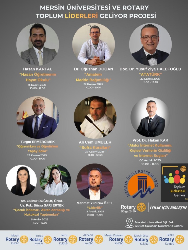 Mersin Rotary Kulüpleri tarafından yürütülen ve Fakültemizin iş birliğiyle gerçekleştirilen “Toplum Liderleri Geliyor” projesi başarıyla tamamlandı. Proje kapsamında, farklı alanlarda deneyim sahibi toplum liderleri fakültemiz öğrencileriyle bir araya gelerek bilgi ve tecrübelerini paylaştı.