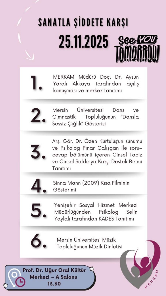 MERKAM ve CTS biriminden hocalarımızın tanıtım sunumlarıyla birlikte Mersin Üniversitesi Müzik Topluluğu ve Mersin Üniversitesi Dans ve Cimnastik Topluluğu öğrencilerinin gösterileriyle şiddetsiz bir gelecek için ortak bir adım atıldı.