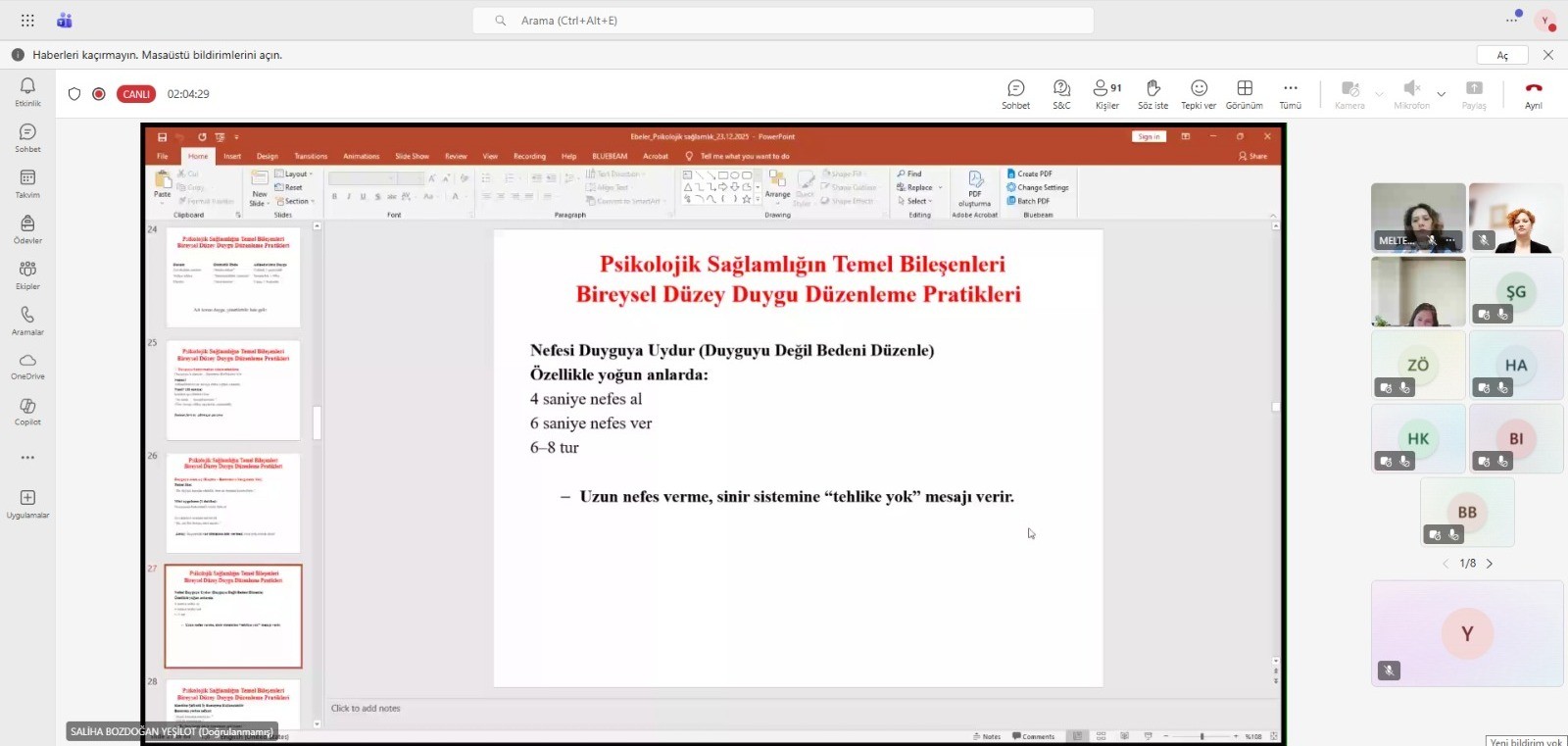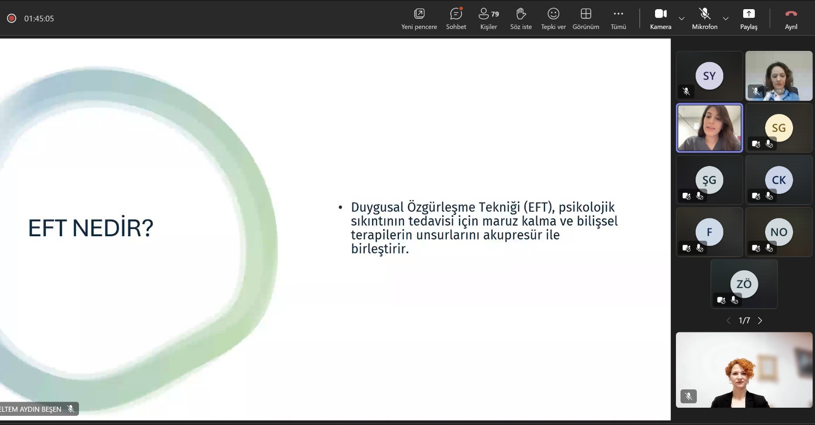 Webinarın moderatörlüğünü Dr. Öğr. Üyesi Sevil Güner üstlenirken, programda alanında uzman akademisyenler ve saha deneyimi bulunan konuşmacılar yer aldı. Etkinlikte, Doç. Dr. Meltem Aydın Beşen tarafından “Ebelerde Duygusal Yük: Tanımı, Kaynakları ve Sonuçları” başlıklı sunum gerçekleştirilerek ebelik mesleğinde duygusal yükün nedenleri ve mesleki etkileri değerlendirildi. Programın ikinci bölümünde Doç. Dr. Saliha Bozdoğan Yeşilot, “Ebelerde Psikolojik Sağlamlık: Koruyucu Faktörler ve Güçlendirme Stratejileri” başlıklı sunumuyla, ebelerin psikolojik iyi oluşunu destekleyen bireysel ve örgütsel faktörleri ele aldı. Webinarın uygulama odaklı bölümünde ise Uzm. Ebe Şeyma Badeci tarafından EFT (Emotional Freedom Techniques) temel bilgilerinin paylaşıldığı ve katılımcıların aktif olarak dahil olduğu bir uygulama atölyesi gerçekleştirildi.
