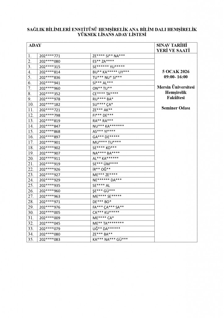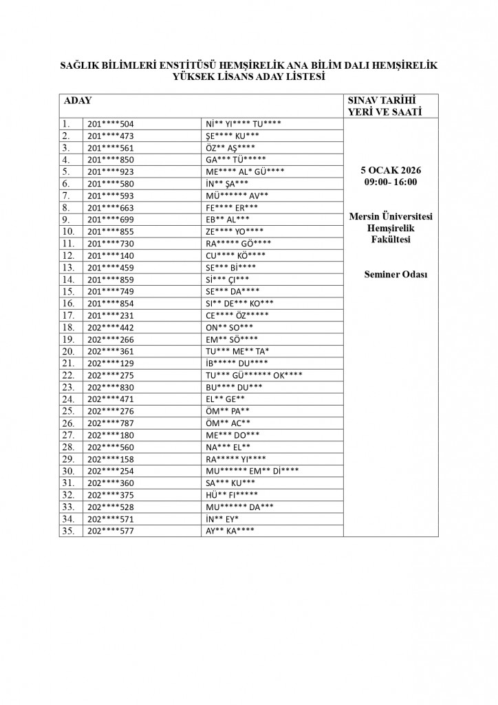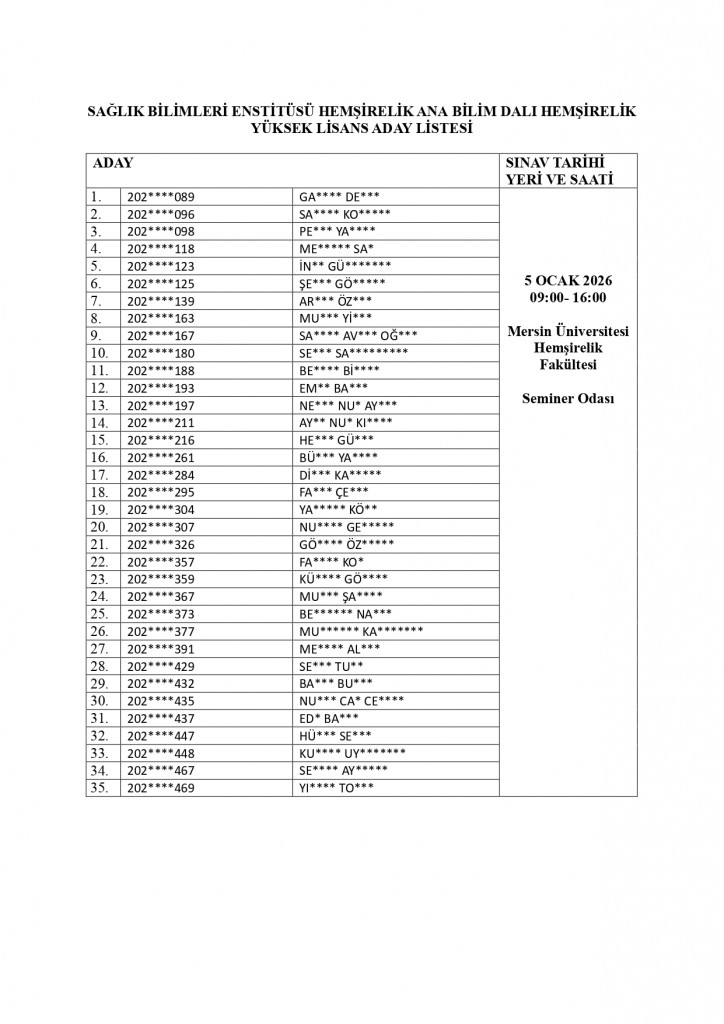 05 Ocak 2026 tarihinde yapılacak olan Hemşirelik Ana Bilim Dalı "Hemşirelik Yüksek Lisans" giriş sınavına ilişkin sınav yeri ve saatini içeren aday listeleri ektedir.
