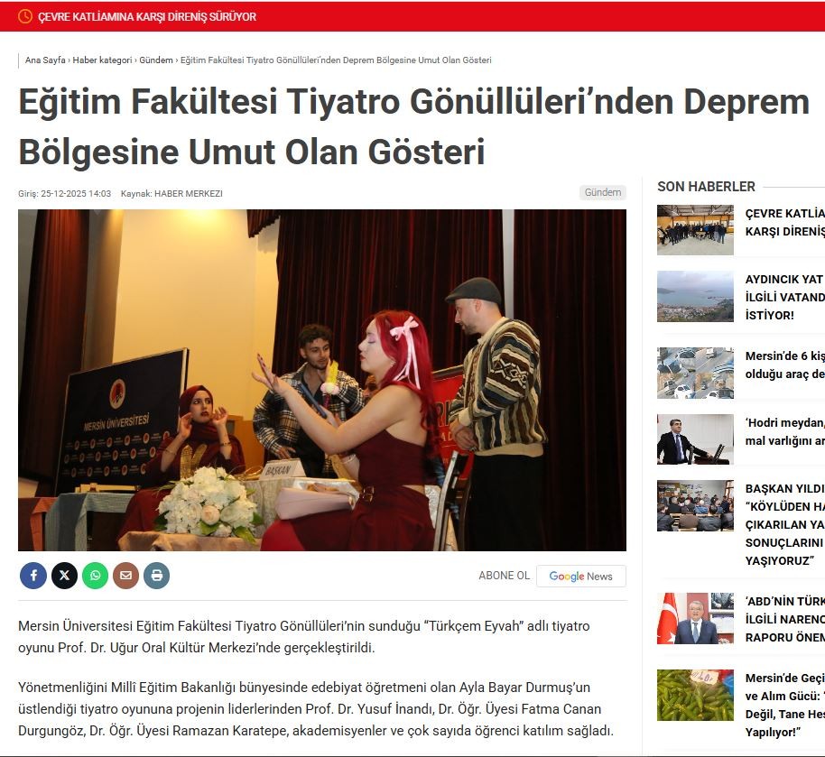 İlgili haber sayfası; Eğitim Fakültesi Tiyatro Gönüllüleri’nden Deprem Bölgesine Umut Olan Gösteri