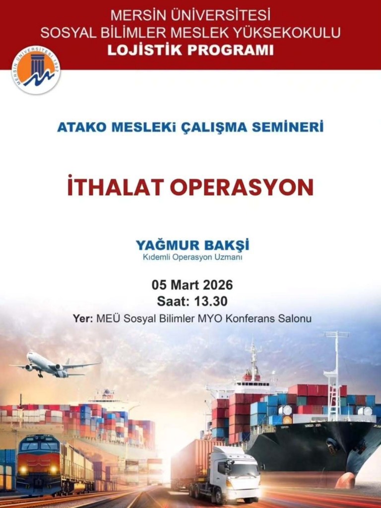 Mersin Üniversitesi Sosyal Bilimler Meslek Yüksekokulu Lojistik Programı tarafından düzenlenen ATAKO Mesleki Çalışma Semineri kapsamında öğrenciler sektör temsilcileriyle bir araya geldi. Etkinlik, Lojistik Programı öğretim elemanları Öğr. Gör. Erdem Daşçı ve Öğr. Gör. Dr. Gül Ferhande Canpolat’ın koordinasyonunda gerçekleştirildi.