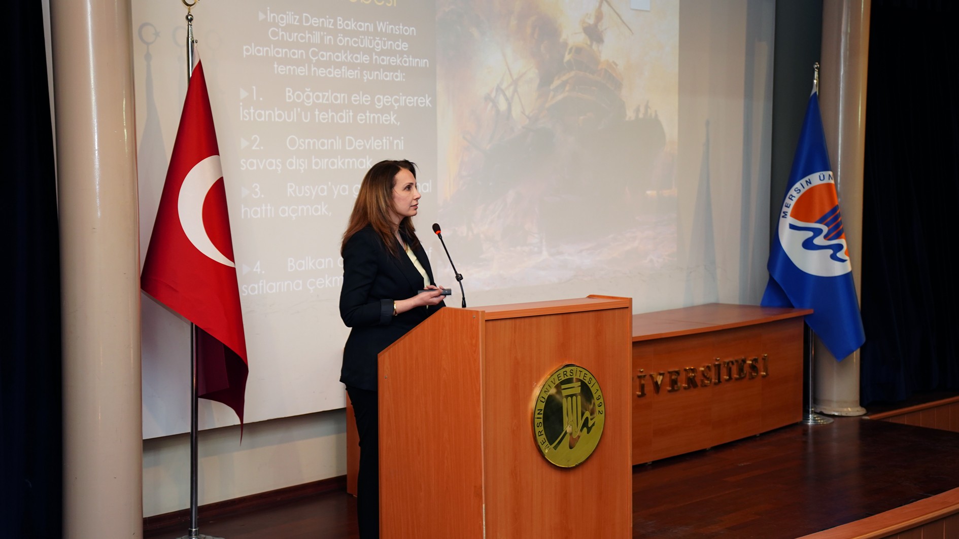 Konferansın açılışında konuşan Prof. Dr. Fahriye Emgili, Çanakkale Savaşları'nın yalnızca duygusal bir hatıra olmadığını, aynı zamanda askerî, siyasi ve tarihsel boyutlarıyla ele alınması gereken, belgeler ve stratejilerle şekillenmiş tarihi bir gerçeklik olduğunu vurguladı. İtilaf Donanması'nın ağır kayıplar vererek geri çekildiği 18 Mart deniz zaferine değinen Prof. Dr. Emgili, bu durumun askerî tarih açısından teknolojik üstünlüğün her zaman stratejik başarı anlamına gelmeyeceği gerçeğini ortaya koyduğunu belirtti.
