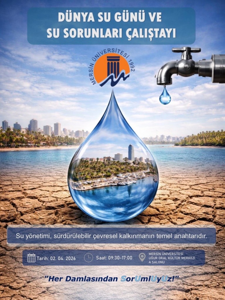 Mersin Üniversitesi Mühendislik Fakültesi Çevre Mühendisliği Bölümü tarafından organize edilen “Dünya Su Günü ve Su Sorunları Çalıştayı”, 2 Nisan 2026 tarihinde Mersin Üniversitesi Uğur Oral Kültür Merkezi A Salonu’nda gerçekleştirilecek. “Her Damlasından Sorumluyuz!” sloganıyla düzenlenen çalıştayda, su kaynaklarının sürdürülebilir yönetimi, iklim değişikliği, kuraklık ve bölgesel su sorunları kapsamlı şekilde ele alınacak.Program, saat 09.30’da saygı duruşu ve İstiklal Marşı ile başlayacak. Açılış konuşmalarını Mersin Üniversitesi Rektörü Prof. Dr. Erol Yaşar ve Mersin Valisi Atilla Toros gerçekleştirecek.