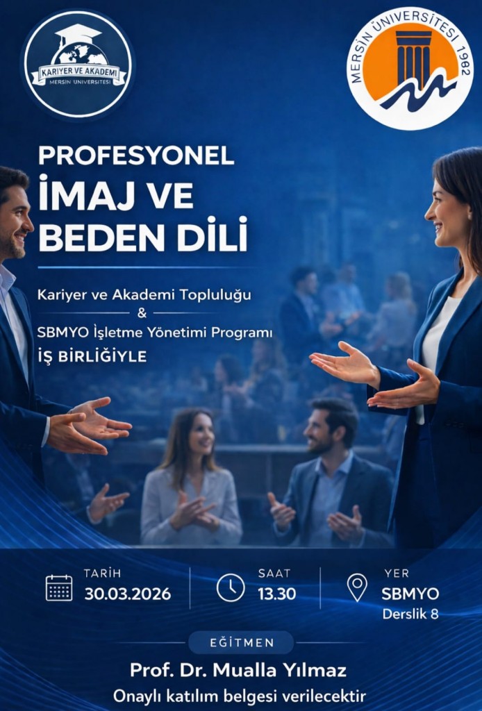Mersin Üniversitesi Sosyal Bilimler Meslek Yüksekokulu İşletme Yönetimi Programı ile Kariyer ve Akademi Topluluğu iş birliğinde düzenlenen “Profesyonel İmaj ve Beden Dili” eğitimi, 30 Mart 2026 tarihinde SBMYO Derslik 8’de gerçekleştirildi.