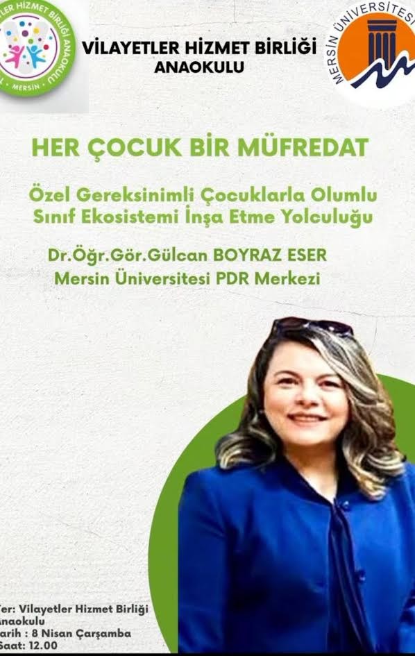 Ailem Okulum Projesi kapsamında . Rehberlik ve Psikolojik Danışmanlık Uygulama ve Araştırma Merkezinde görev yapmakta olan Ögr. Gör. Dr. Gülcan BOYRAZ ESER 08 Nisan 2026 tarihinde Özel Gereksinimli Çocuklarla Olumlu Sınıf Ekosistemi İnşa Etme Yolculuğu semineri ile Vilayetler Hizmet Birliği Anaokulu öğretmenleriyle bir araya gelecektir.