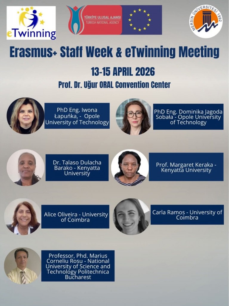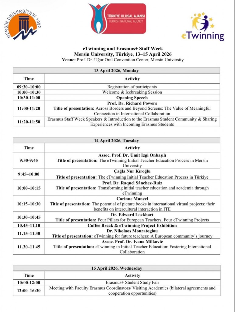 Mersin Üniversitesi ev sahipliğinde, 13–15 Nisan 2026 tarihleri arasında Prof. Dr. Uğur Oral Kongre Merkezi’nde “Erasmus+ Staff Week & eTwinning Meeting” etkinliği gerçekleştirilecektir.