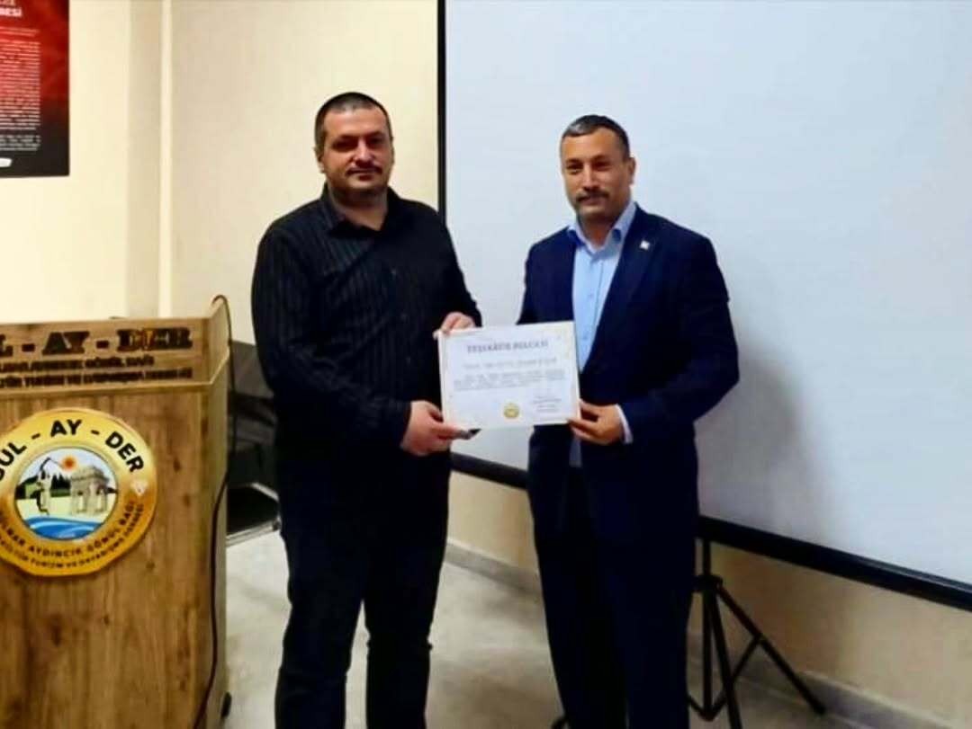 Program sonunda Gül-Ay-Der Başkanı Kemal Gülnarlı tarafından katkılarından dolayı Öğr. Gör. Dr. Alaiddin Koşar’a teşekkür belgesi takdim edildi.