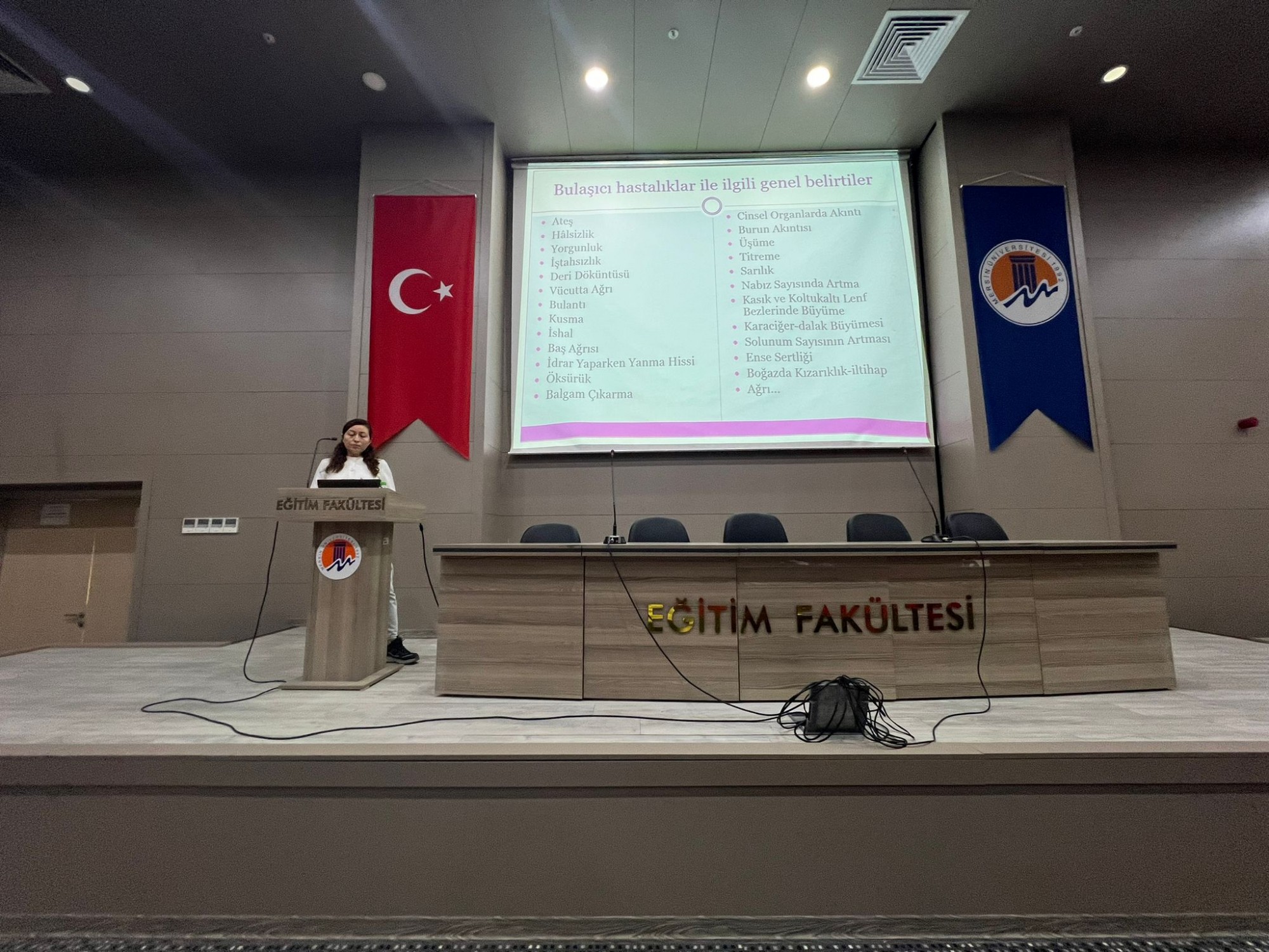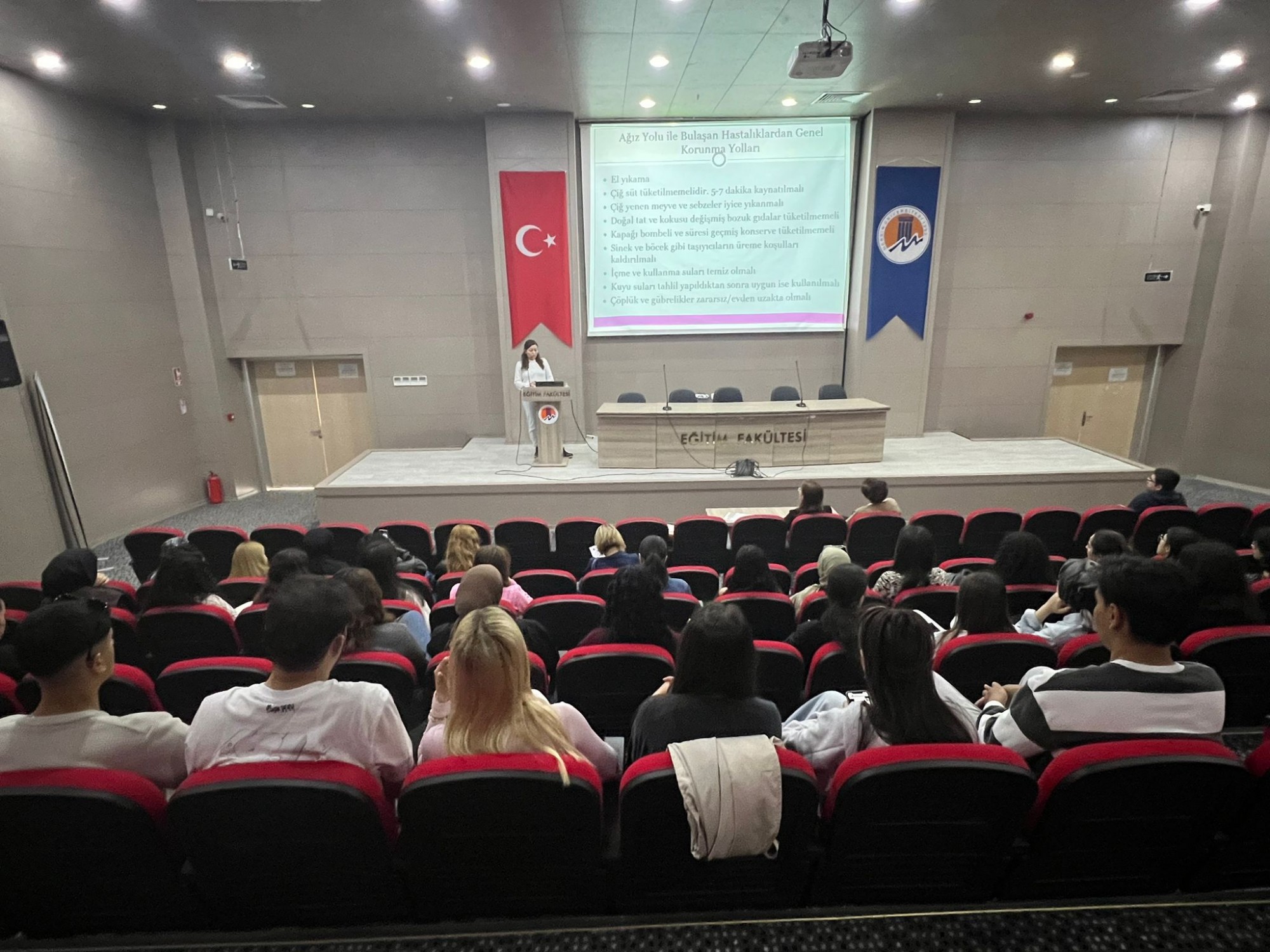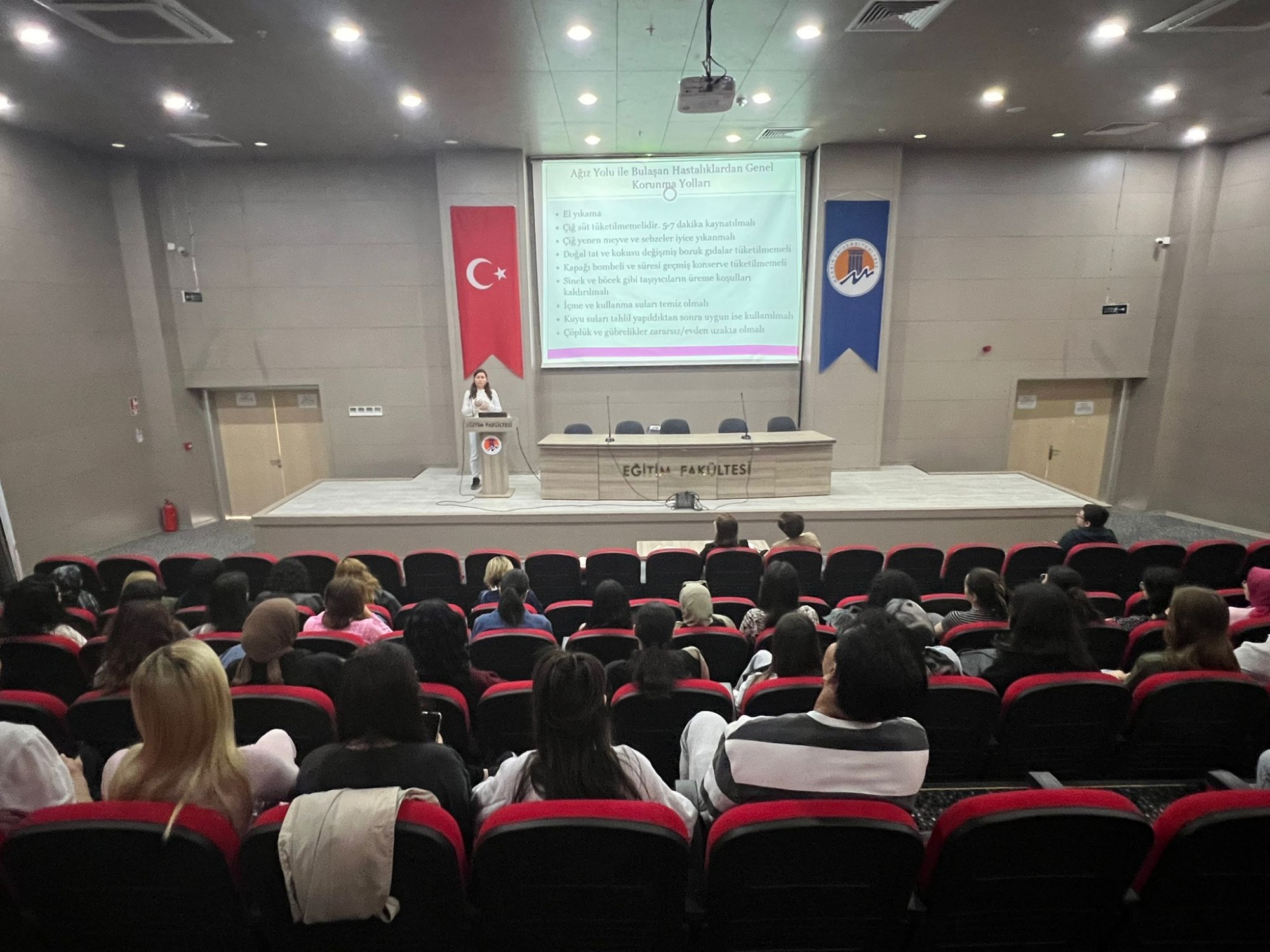 Fakültemiz öğrencilerine yönelik olarak, bulaşıcı hastalıklarla mücadele ve hijyen konusunda farkındalık oluşturmak amacıyla bir eğitim programı düzenlendi. 14 Nisan 2026 tarihinde Ahmet Çamsarı Konferans Salonu’nda gerçekleştirilen eğitimde, katılımcılara bulaşıcı hastalıkların önlenmesi, hijyen kurallarının önemi ve günlük yaşamda alınması gereken koruyucu önlemler hakkında kapsamlı bilgiler verildi. Eğitim kapsamında, bireysel hijyen uygulamalarının toplum sağlığı üzerindeki etkisine dikkat çekilerek; doğru el yıkama teknikleri, enfeksiyonlardan korunma yolları ve hijyen alışkanlıklarının geliştirilmesine yönelik önemli bilgiler paylaşıldı. Katılımcıların yoğun ilgi gösterdiği etkinlik, soru-cevap bölümüyle interaktif bir şekilde tamamlandı. Eğitim sonunda, katkılarından dolayı eğitmenlere teşekkür belgesi, Dekan Yardımcımız Doç. Dr. Özlem Elvan tarafından takdim edildi.